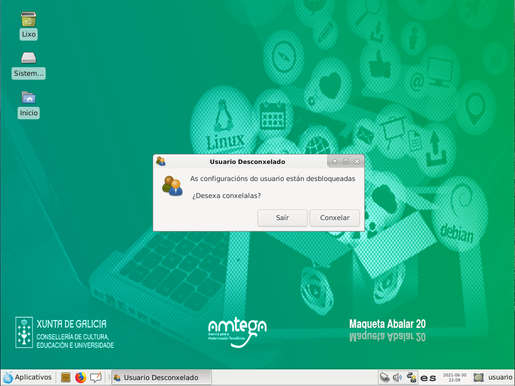 • Ao pulsar sobre esta opción, o sistema informa de que actualmente están desbloqueadas as configuracións do usuario e pregunta se realmente queremos proceder a realizar a conxelación.
