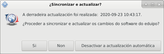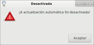 - Desactivar a actualización automática, mostraría unha mensaxe de advertencia, e deste xeito que quedaría desactivada a execución mensual automática da aplicación.