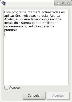 Ao premer neste novo aplicativo, vai a aparecer unha nova xanela con información relativa as funcións que ten dita aplicación; tendo o usuario que activar o check "Aceptar" e premer no botón para que o Actualizador realice as súas funcións.