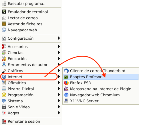 A hora de lanzar o aplicativo, habería que desprazarse ao menú "Internet - Epoptes Alumno"