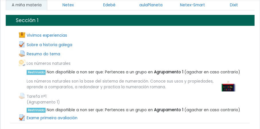 Os alumnos que forman parte do agrupamento ao que van destinados eses elementos (un tema + unha actividade) poden visualizar e acceder normalmente a eses contidos. A estes alumnos en ningún caso se lles mostra ningunha información que lles indique que eses contidos van destinados a eles e non outros compañeiros, sempre e cando se ocultase a restrición.