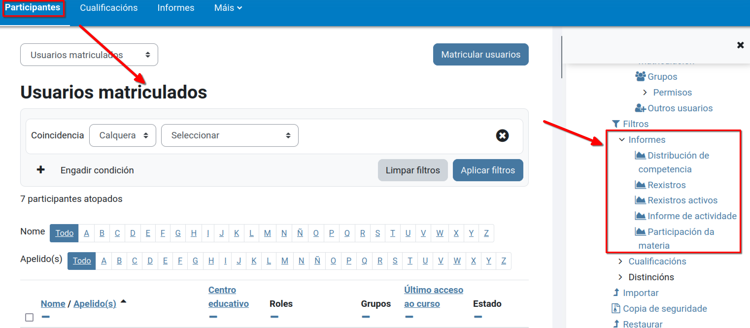 - filtrar por rol (profesor, alumno, profesor sen edición, creador da materia ...)