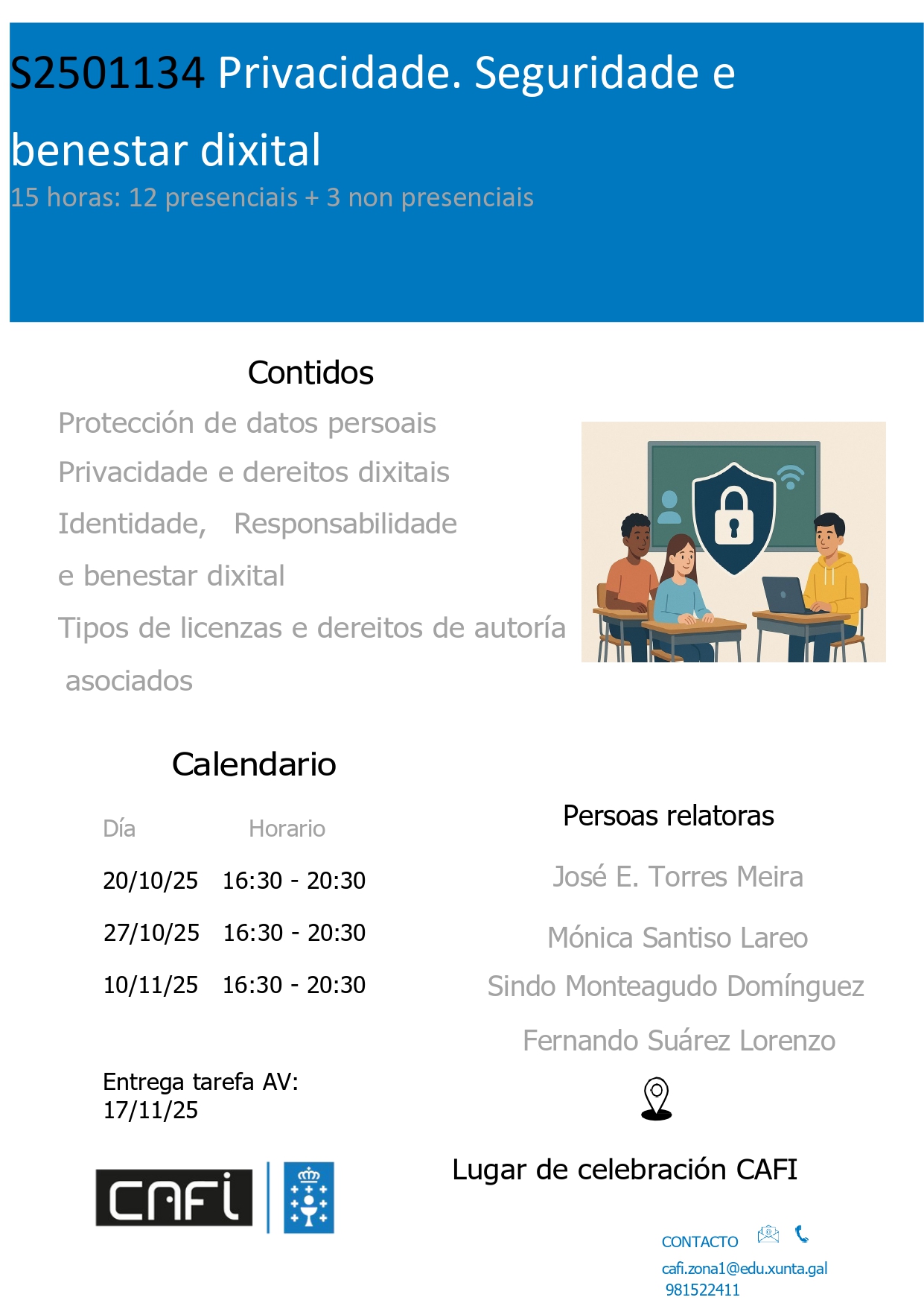 Este curso de formación do profesorado ofrece unha visión práctica e actual sobre o uso responsable e seguro das tecnoloxías dixitais. Abórdase a identidade e o benestar dixital, así como os distintos tipos de licenzas e dereitos de autoría. Tamén se analizarán as principais condutas de risco en liña e os mecanismos de prevención da ciberdelincuencia. Finalmente, revisarase o protocolo de protección de datos aplicable ao ámbito educativo.