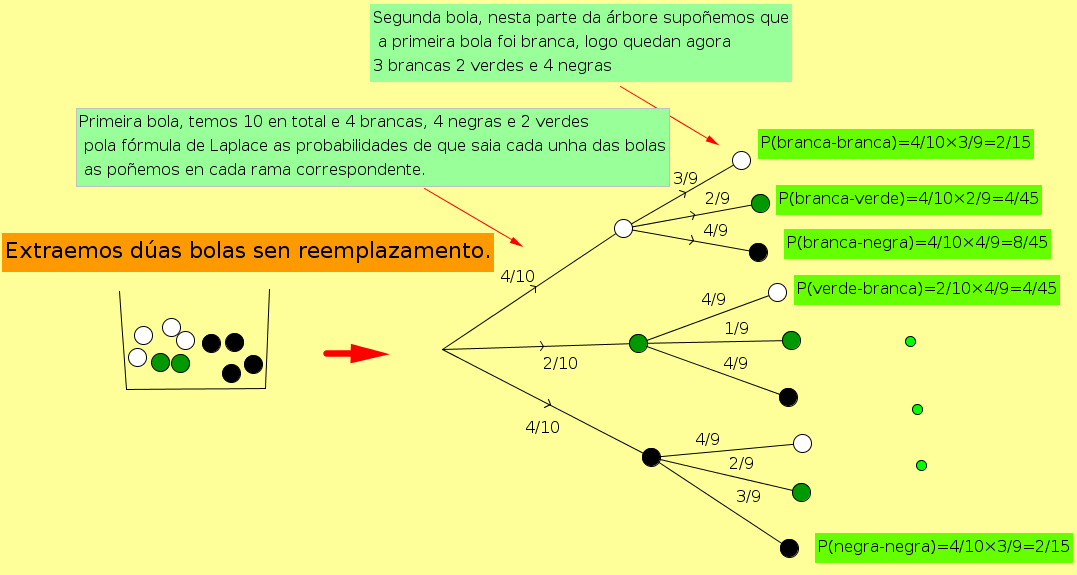 Tarefa: Calcula a probabilidade de obter dúas bolas da mesma cor (tes que sumar a probabilidade dos resultados branco-branco, verde-verde, negro-negro).