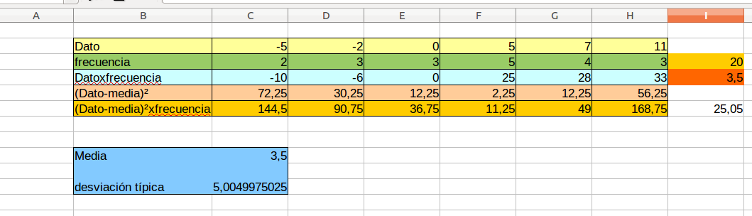 Como ves para calcular a raíz temos unha función chamada RAIZ(número) onde número é neste caso a varianza que está na celda I6. Para rematar dalle unha apariencia personificada e garda o arquivo co nome MediaDesTip.