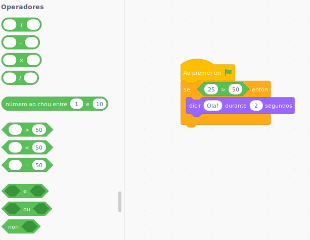 Antes de usar os condicionais tes que practicar cos bloques de operacións (cor verde).