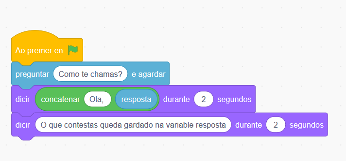 O programa básico de facer preguntas usa o comando pregunta no apartado de sensores e a reposta queda gardada na variable azul resposta. Vexamos un exemplo: