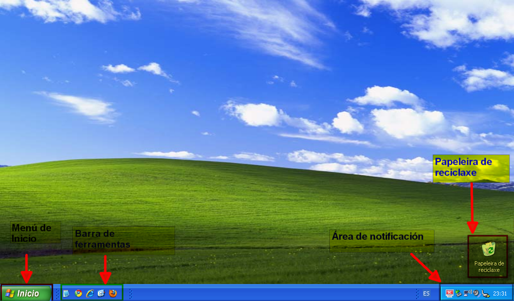 Despois de instalar Windows XP, o primeiro que vemos en pantalla é o chamado "Escritorio". Nun primeiro lugar está case baleiro, como vemos na imaxe inferior.