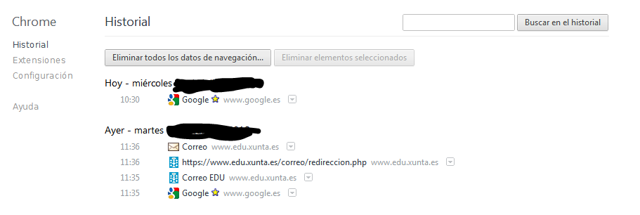 Os navegadores gardan un historial dos sitios web que visitamos; desta maneira podemos volver a sitios xa visitados ainda que non lembremos o enderezo. Esto ten un lado negativo nos equipos compartidos, e é que todos os usuarios saben que páxinas (non quen) se visitan dende este equipo, por eso resulta convinte limpar o historial regularmente.