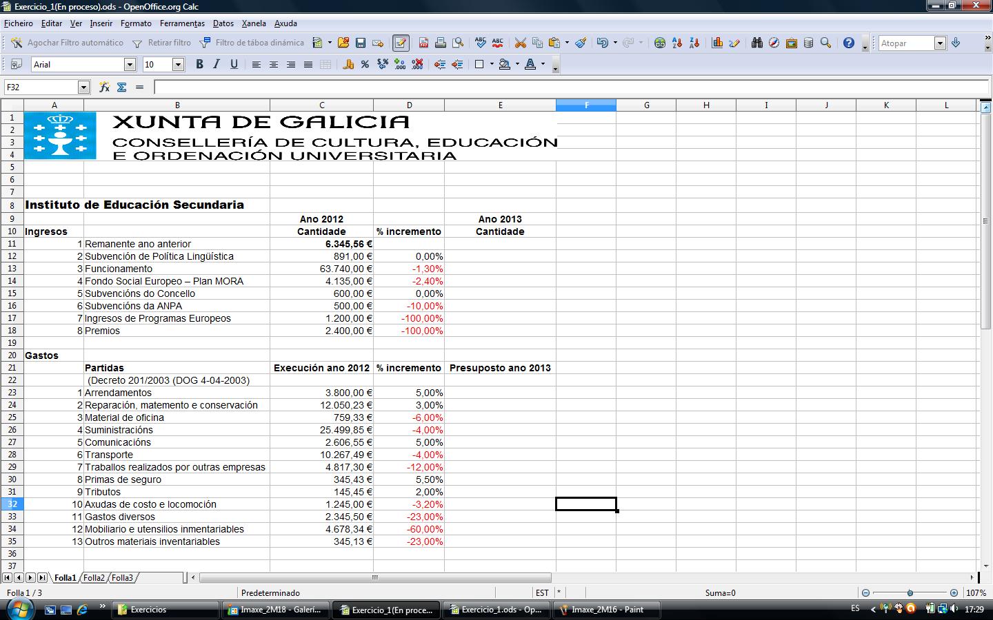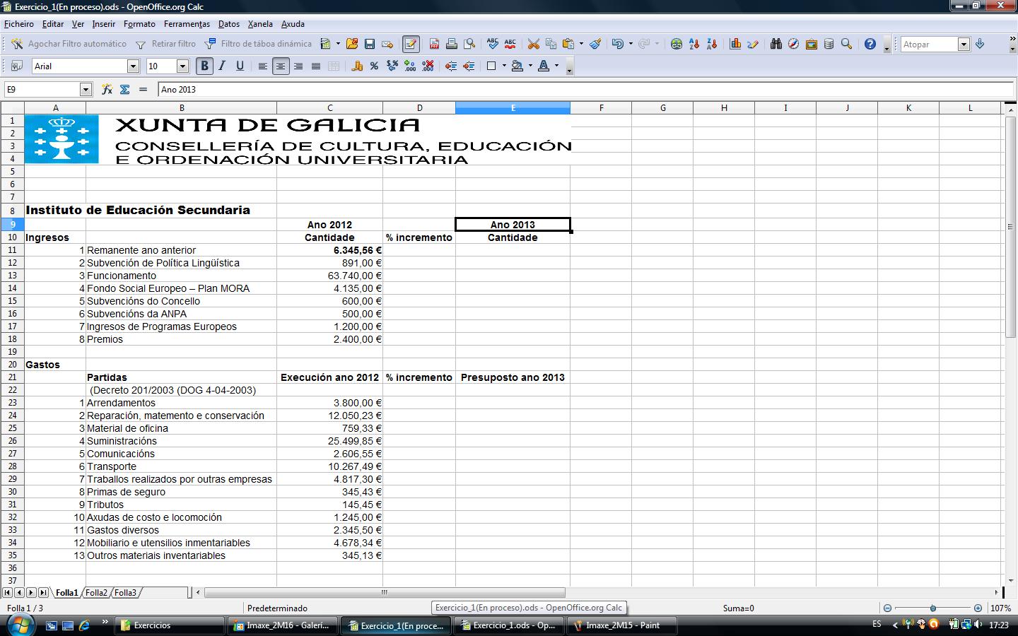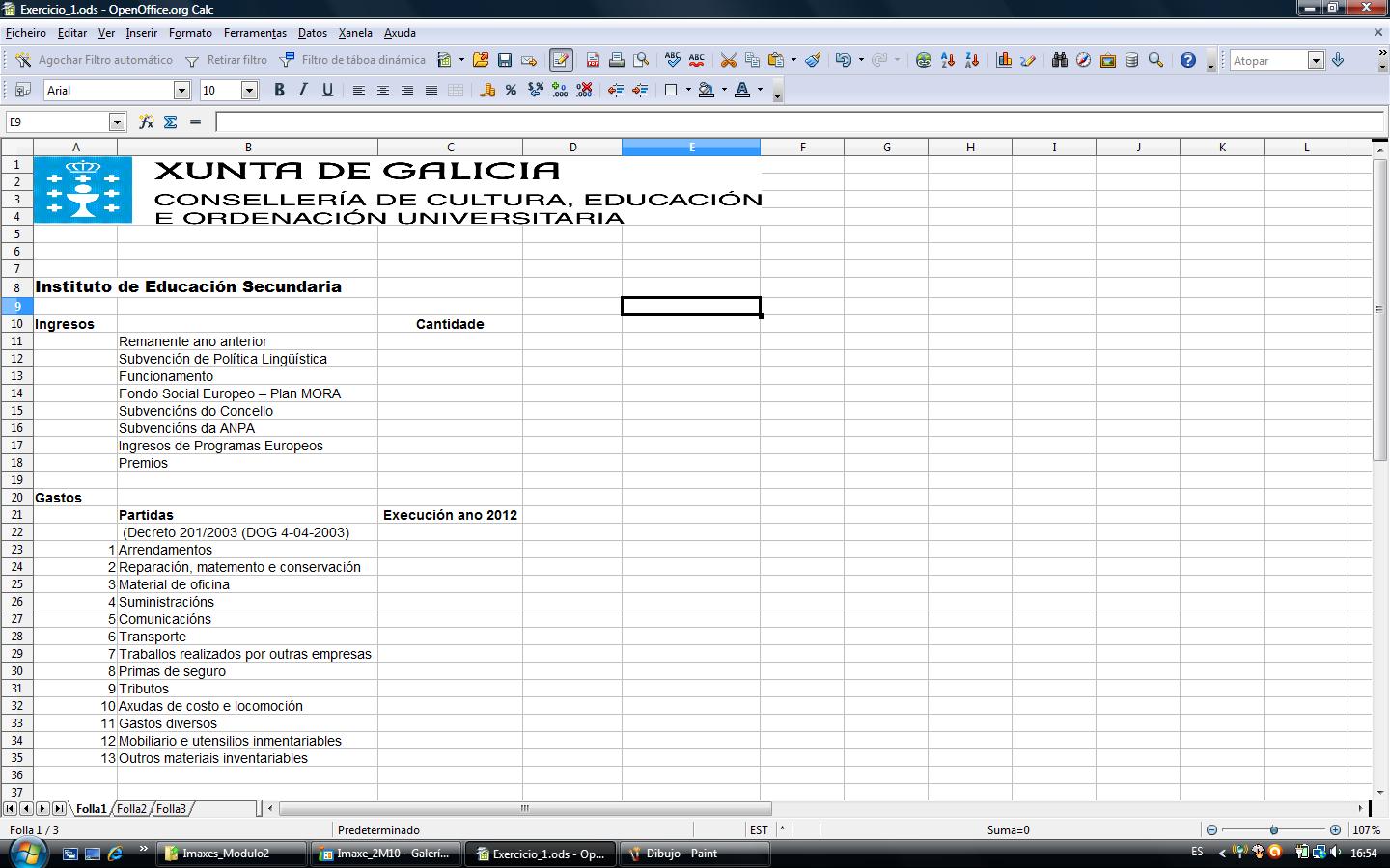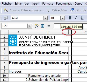 Imos dando forma ao noso documento de presuposto e engadimos os datos da execución dos orzamentos do centro no ano anterior tanto de ingresos como de gastos. Obtemos así a folla seguinte: