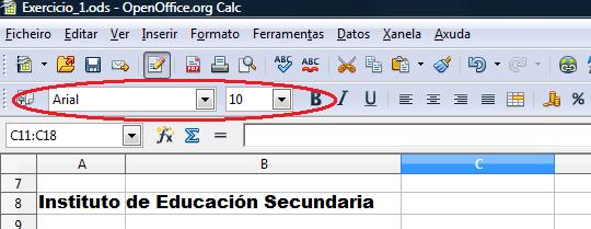 No documento anterior centraremos os números da primeira columna, imos poñer en negriña algunhas das celas e a fonte que seleccionaremos para os textos será arial 10. Todas estas operacións as realizaremos coa barra de ferramentas