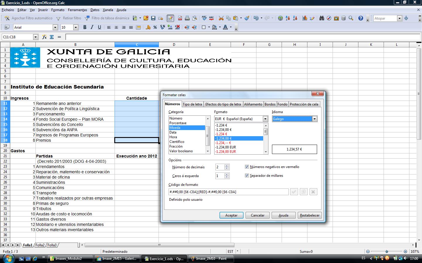 Eliximos moeda, con formato de dous decimais e para que apareza en vermello as cantidades negativas; en idioma seleccionaremos o galego.
