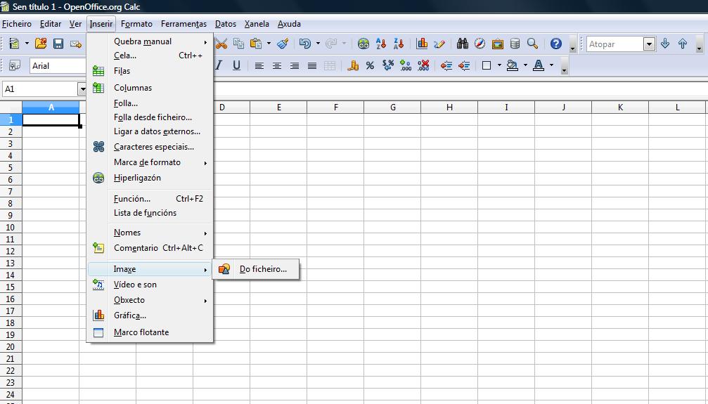 Na cela A1 colocaremos unha imaxe, esta imaxe pode ser un escudo, un anagrama, etc…, que identifique o centro educativo. As imaxes que poñemos como encabezamento da folla se incluirán do seguinte xeito. No menú superior escollemos Inserir, imaxe dende arquivo, seleccionando o arquivo onde temos a imaxe que queremos inserir.