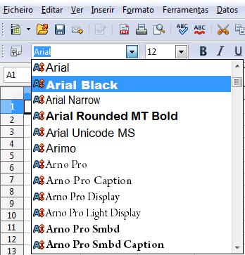 Selecionamos agora a cela A8 e lle cambiamos o tipo de letra e o tamaño, Arial Black e tamaño 12 para resaltar o texto da cela do resto, na barra de ferramentas ou no combo de formato de texto con: