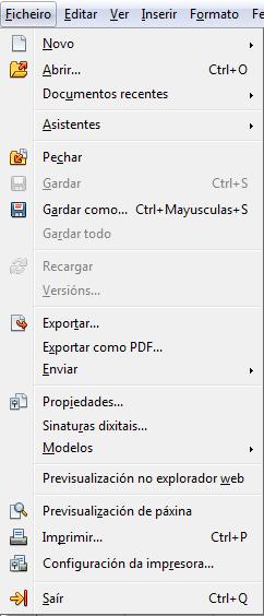 As veces á dereita da acción a realizar aparece Ctrl + “unha letra” ou Ctrl + Maiúsculas + “unha letra”. Isto indica que dita acción tamén se pode realizar desde o teclado con esa combinación de teclas.