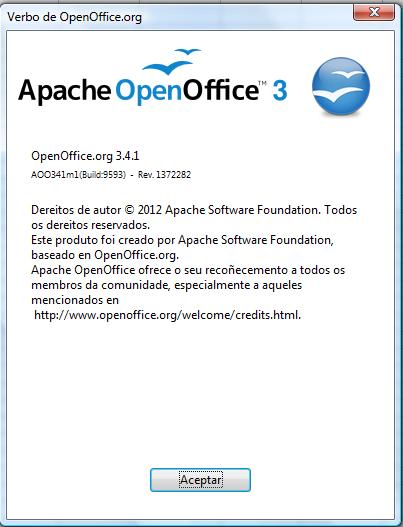 Premendo en Sobre OpenOffice.org, podemos obter toda a información relacionada co programa: versión, dereitos de autor, organización, membros da comunidade, etc...