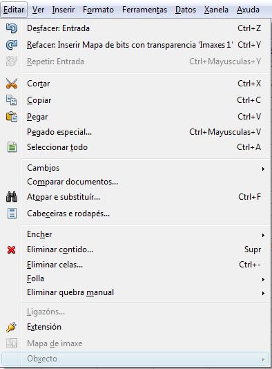No menú e en Editar, pódese realizar as seguintes accións: