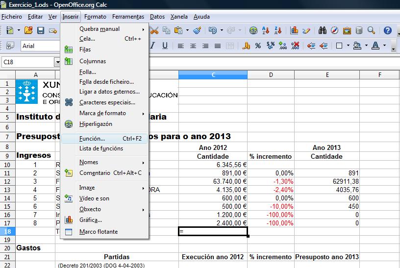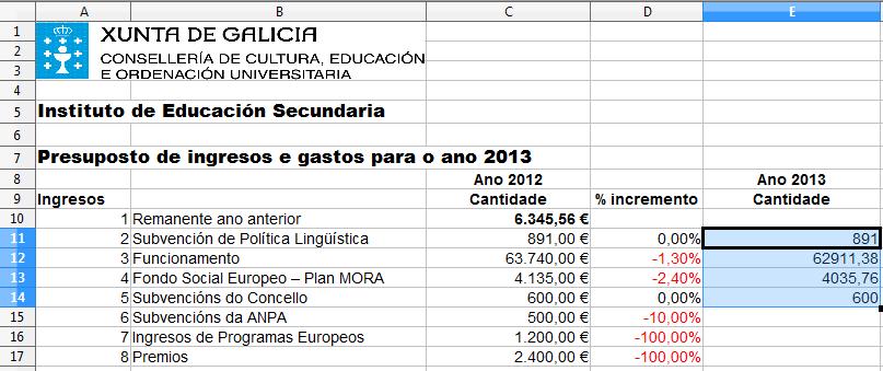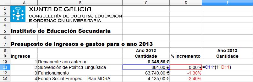 Para o cálculo do presuposto do ano seguinte aplicamos as porcentaxes anteriores a cada partida e colocamos os resultados na columna E, para iso temos que introducir a fórmula: