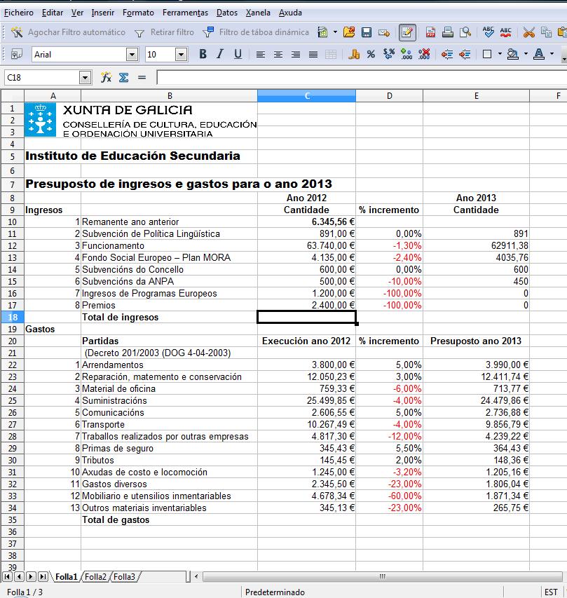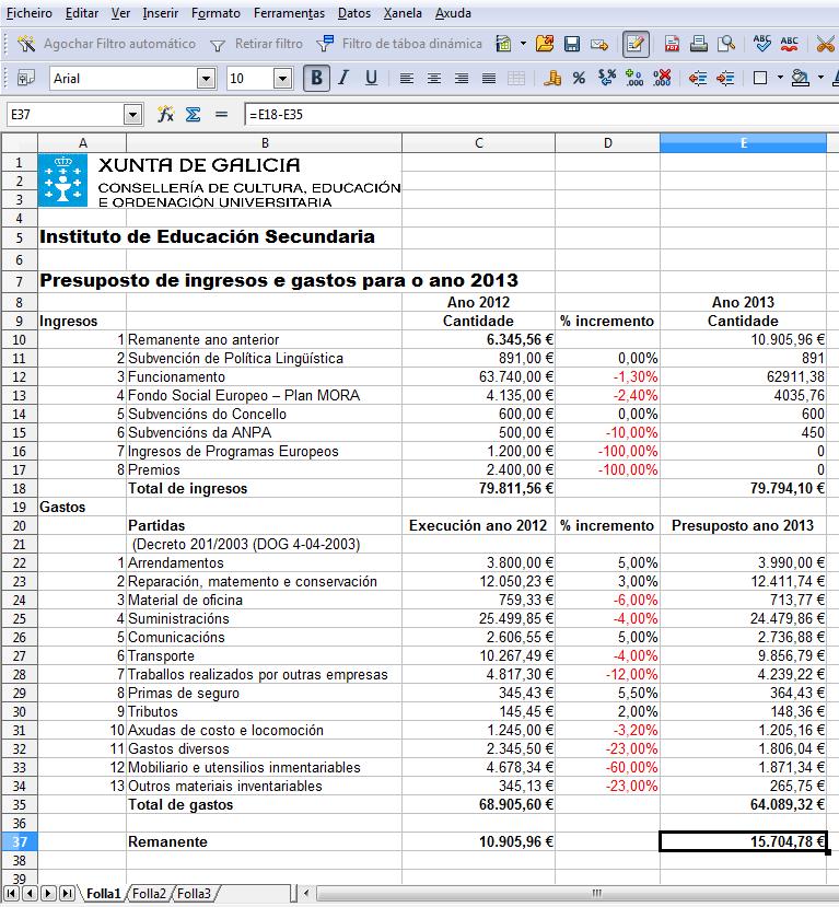 Facendo as sumas correspondentes nas celas E18 e E36, e o cálculo do remanente presupostado para o fin de ano 2013, así como uns cambios de formato resaltando os totais e os remanentes con negriña, obtemos o seguinte documento: