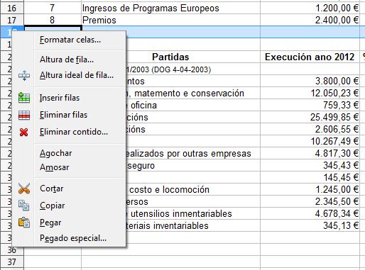 Mediante a opción do menu Inserir podemos engadir filas, columnas, celas,… pero esta operación tamén a podemos realizar premendo co botón dereito do rato enriba dun número de fila á esquerda de todo da zona de traballo do Calc.