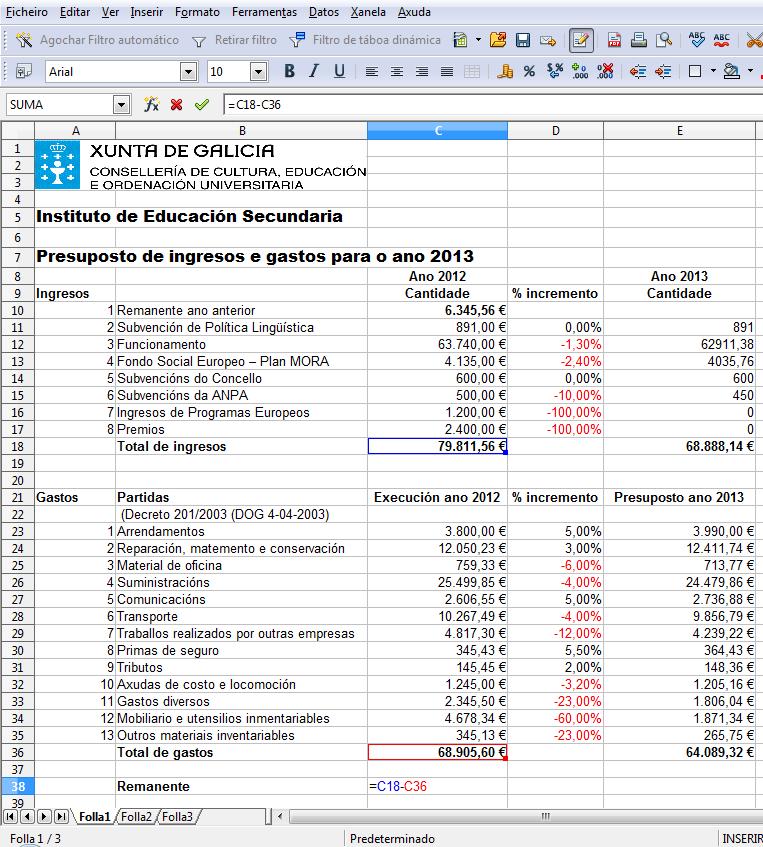 Na fila 38 e na columna B engadimos un novo texto “Remanente” e na cela C38 introducimos a expresión, =C18-C36, para calcular automaticamente o remanente que nos queda ao restar aos ingresos os gastos.