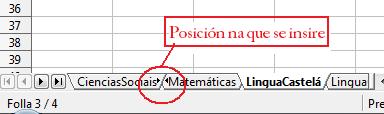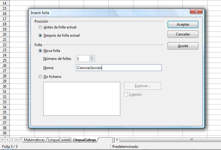 - Creamos unha nova folla a continuación de LinguaGalega pulsando sobre Inserir folla… do menú contextual (ou dende o menú Inserir > Folla…) no cadro de diálogo que aparece escollemos Despois da folla actual e como nome poñémoslle CienciasSociais.