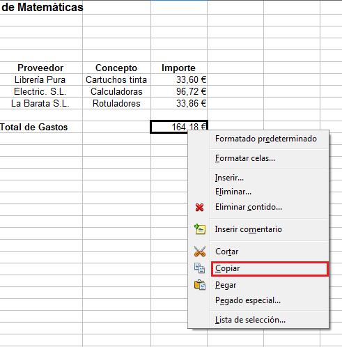 - Imos á folla Matemáticas e selecionamos a cela onde figura o importe total dos gastos e facendo un clic co botón dereito do rato copiamos o contido da cela E11.