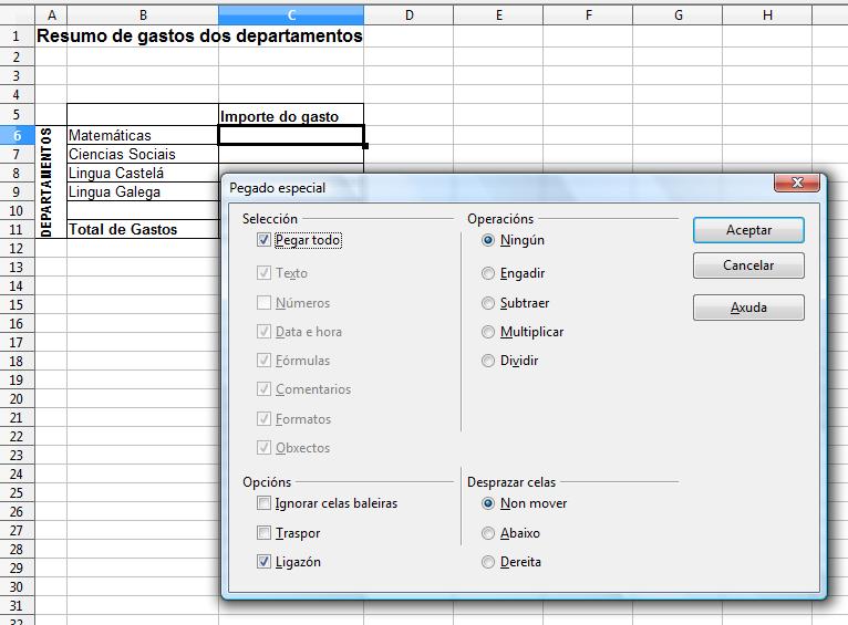 Esta é a folla resumo dos gastos dos departamentos, en consecuencia queremos que o total de gastos do departamento de matemáticas apareza na cela C6, os de Ciencias Sociais deberán figurar en C7, os de Lingua Castelá en C8, os de Lingua Galega en C9. Para que ao realizar un cambio en calqueira das páxinas e este cambio se incorpore na páxina de resumo podemos proceder de duas formas: