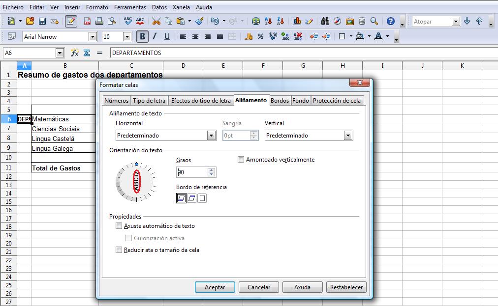 Na cela A6 imos teclear o texto “ Departamentos” e tipo de letra Arial Narrow, tamaño 10 e en negriña.