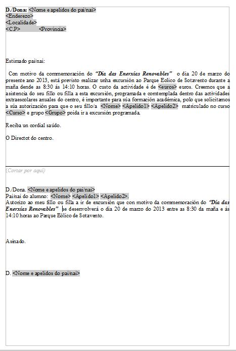 No documento anterior queremos substituír os textos que están sombreados en negriña polos valores personalizados de cada familia á que vai dirixida o comunicado.