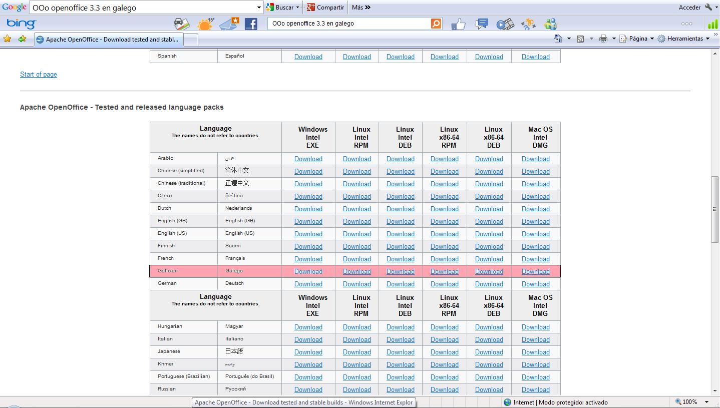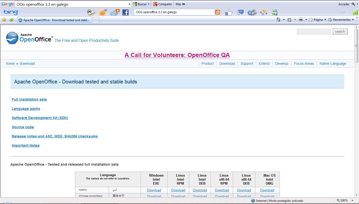 Nas datas que se constuíu este curso a última versión en galego que estaba publicada na páxina oficial era a OpenOffice 3.4.1. Se non tes instalado no teu ordenador este paquete ofimático ou tes unha versión máis antiga ou queres usar a versión en galego, tes que premer co rato enriba da seguinte ligazón:
