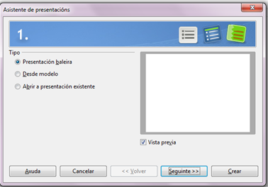 Ao abrir Impress, sobre todo por primeira vez, aparecerá o Asistente de presentacións