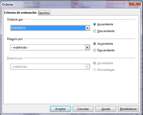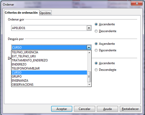 Dende este cadro, podemos escoller, ademais, que ordene por ata tres campos, por orde de prioridade. Por exemplo, en relación á folla de cálculo do XADE, podemos querer ao alumnado ordenado por orde alfabética, segundo o apelido e segundo o curso, sen ter en conta o grupo.