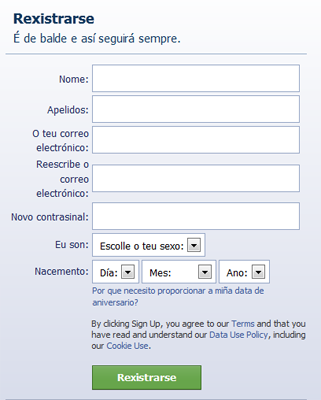 Accedemos ao enderezo http://www.facebook.com/ e completamos o formulario de rexistro