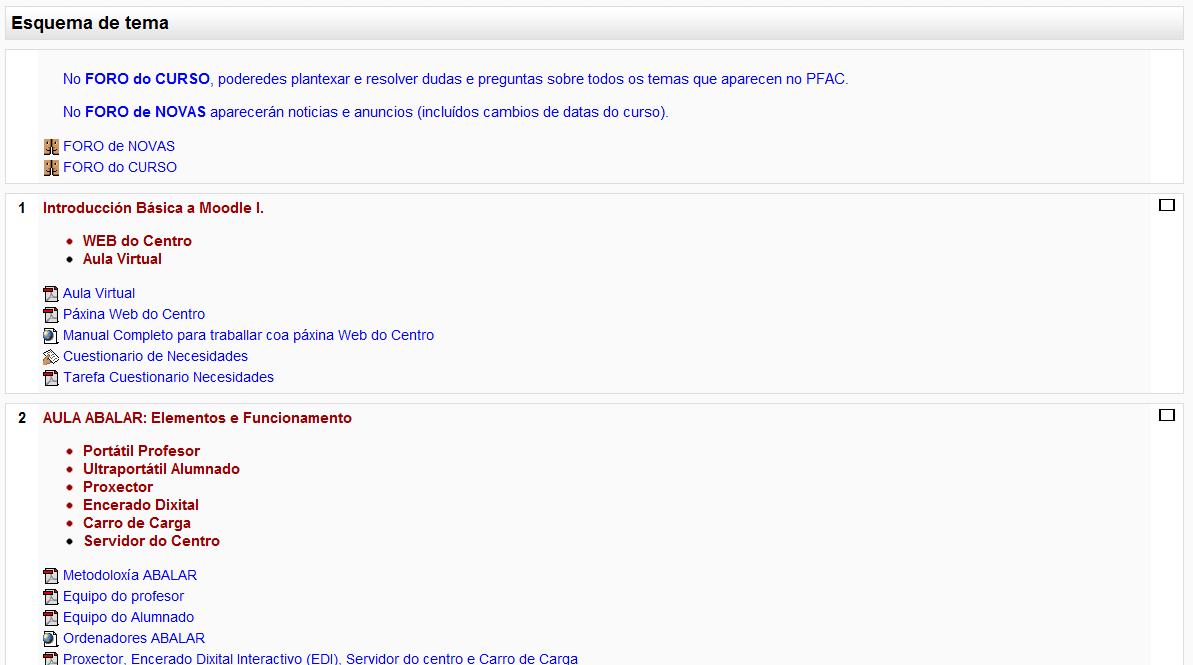 Normalmente, o primeiro recadro da Aula Virtual é Esquema de tema que é coma un resumo do curso e as indicacións precisas para a súa realización; tamén aparece nese recadro o Foro de novas no que o profesor/a uo coordinador/a comuníca e trasmite avisos aos estudantes. Ás veces, tamén hai un Foro do Curso no que todos os participantes no curso poden interactuar e comunicarse.