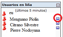 Neste bloque Usuarios en liña, aparece todo o alumnado/profesorado que está conectado ao curso nun determinado momento, co cal podes ter unha mensaxería individual instantánea (chat) sen máis que premer no icono do sobre que tés ao lado do nome do usuario conectado.
