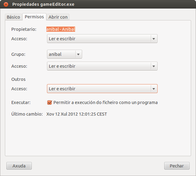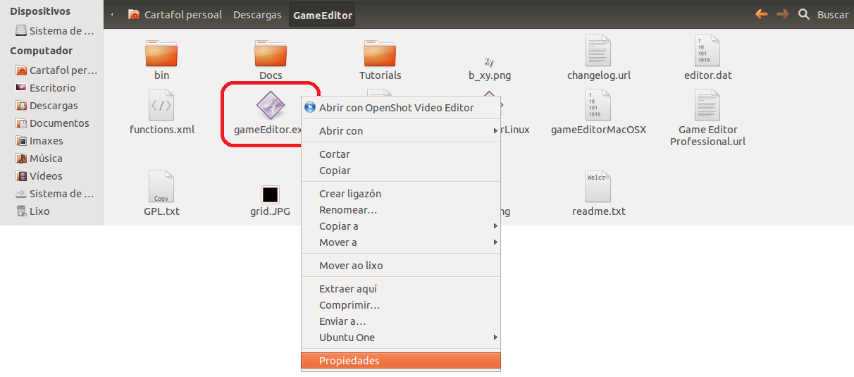 Agora abrimos o cartafol e localizamos o GameEditor.exe, temos que dar un paso moi importante xa que para que se execute temos que darlle permisos de programa: seleccionamolo, botón dereito do rato, imos a Propiedades> pestana de permisos> todos os accesos:Ler e escribir >Executar: Marcado
