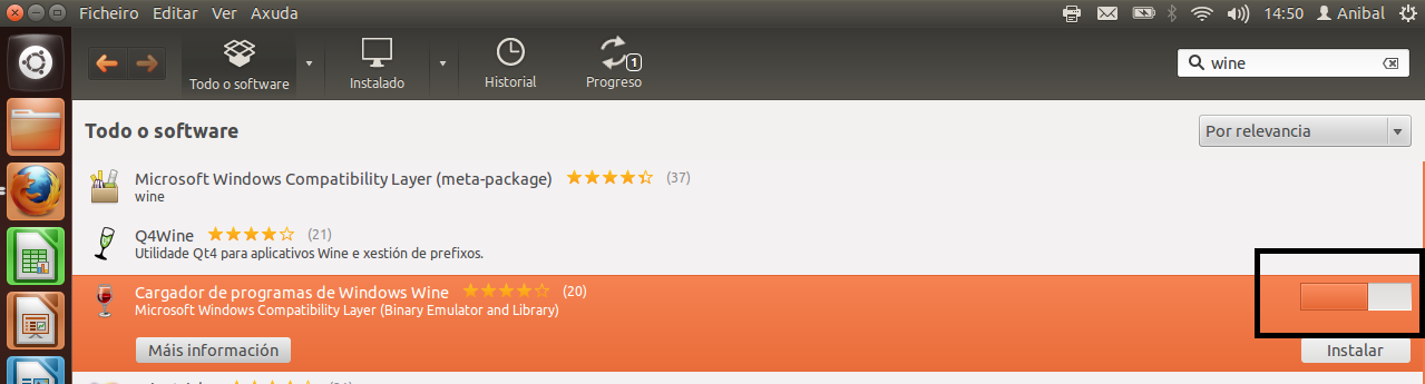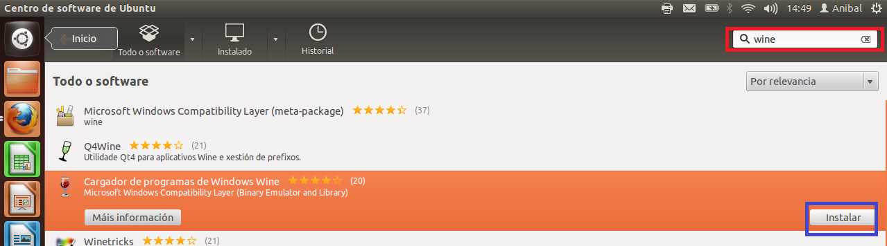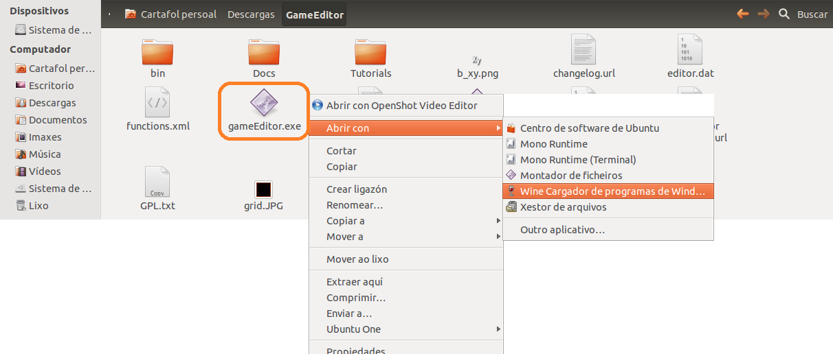 O Game Editor, un editor de xogos, é un exemplo de coma se executa (non se instala) un programa de windows .exe (gameEditor.exe) en Ubuntu. Para logralo, necesitamos instalar un programa chamado WINE que non ten maior problema, pois está no Centro de Software de Ubuntu.![]()