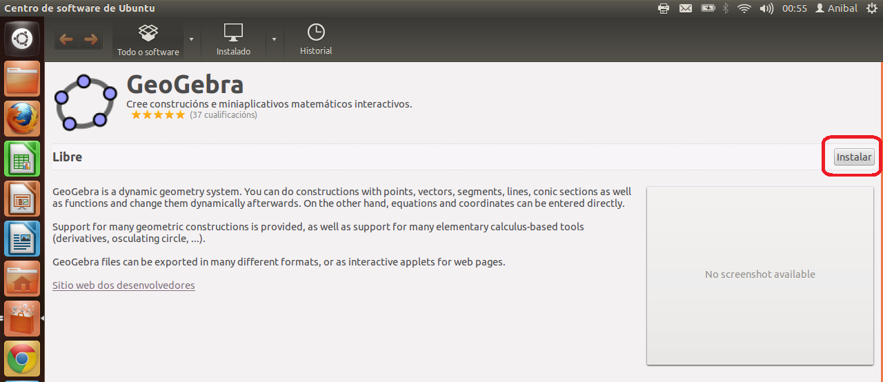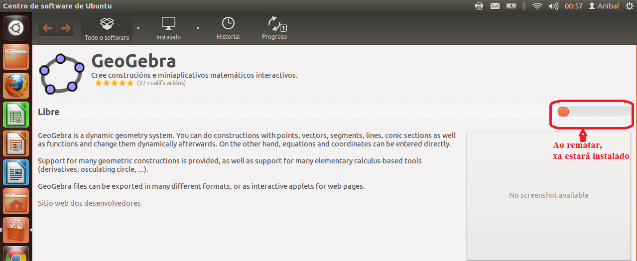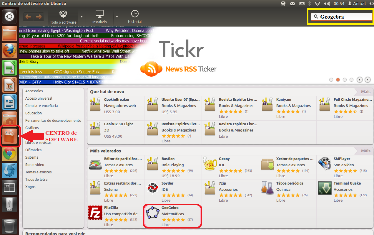 Geogebra en un programa de matemáticas que está no Centro de Software de Ubuntu, para instalar, procedemos:1º.- Abrimos o Centro de Software: