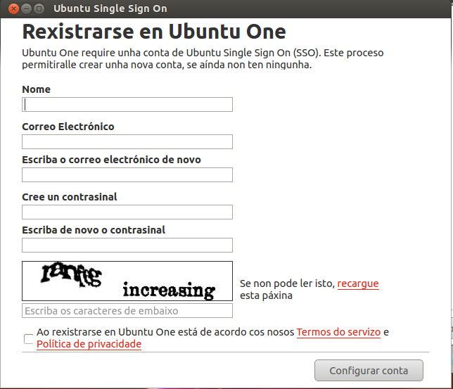 O primeiro paso é crear unha conta, para iso facemos click en "Ubuntu One" e abriranos unha ventá onde poderemos levar a cabo o proceso de rexistro. (Imaxe 3.2)