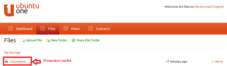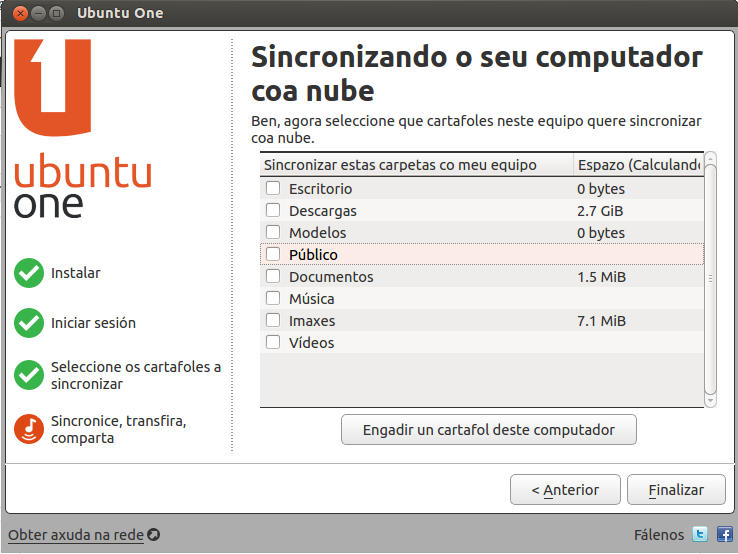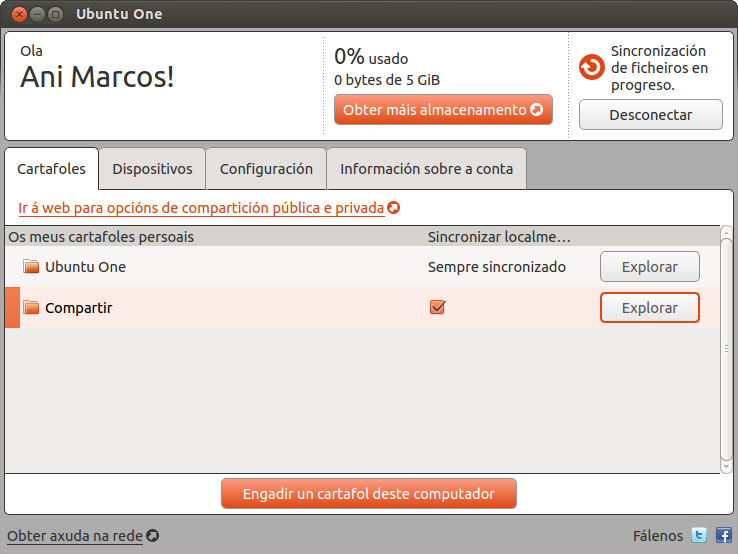 Por defecto, ao rexistrarse xa se crea un cartafol chamado Ubuntu One no ordenador que xa está sincronizado, pero danos a posibilidade de sincronizar máis, para o manual eliximos unha carpeta que creamos no cartafol Personal chamada Compartir. Polo tanto prememos ene buscamos no noso ordenador: