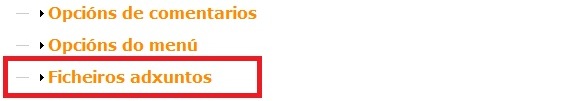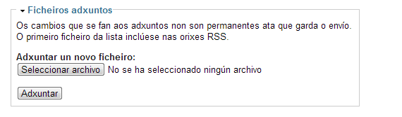 na que ao premer en Seleccionar Archivo, aparece o explorador do noso ordenador, para buscar e elixir o arquivo que queiramos, e, para rematar, premer en Adxuntar. Se queremos adxuntar outros arquivos hai que repetir o proceso. Cando se publique a historia na Páxina Web, aparecerá nunha esquina da noticia, un icono ou un texto de Ficheiros Adxuntos ou Documentos.