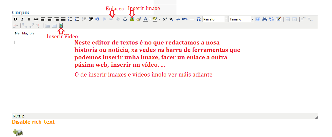 Unha vez que decides que Título e onde publicar a noticia, descendendo pola páxina aparece un editor de texto, o Corpo do Contido, no que temos que escribir a nosa historia: