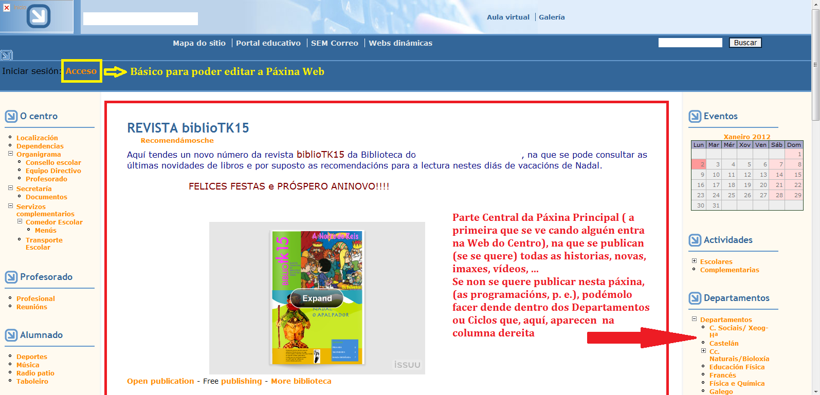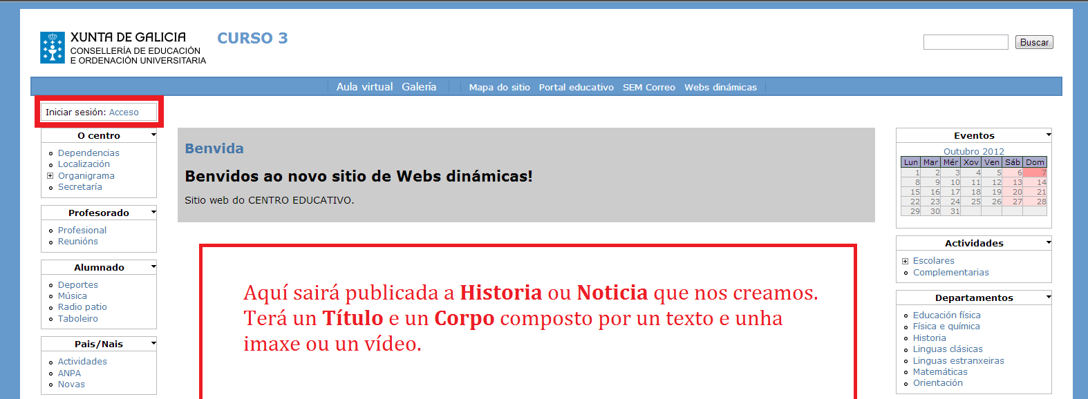 Se é a Páxina do Centro, algo parecido a esta imaxe,pero non igual, xa que as Plantillas ou Temas da páxinas en DRUPAL son moitas e moi variadas con distintos formatos e cores, pero o que sempre aparece son: Aula Virtual, Galería, Mapa do sitio, Portal Educativo, SEM correo, Webs Dinámicas e sobre todo, INICIAR SESIÓN: ACCESO
