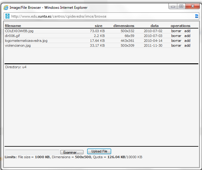 Hai que ter enconta os límites que pon Drupal para subir arquivos: Tamaño 1000KB, Dimensións 500x500 Pixels e temos unha cuota de almacén de 10000KB.