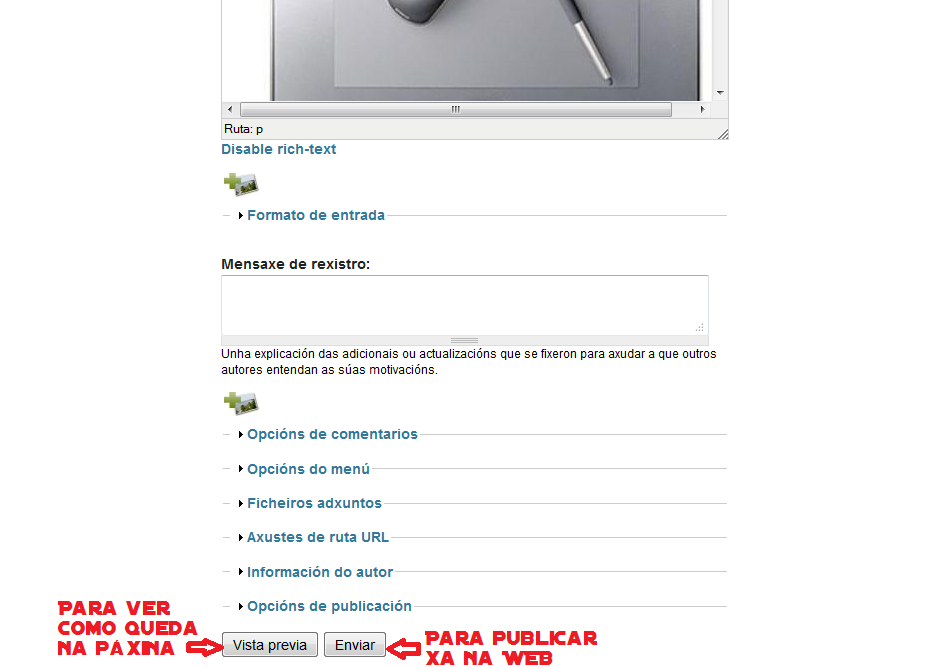 2º.- Unha vez que aparece o arquivo na lista, hai que situar o cursor no lugar do Corpo no que queremos poñer a imaxe e prememos en add. E xa aparece a imaxe no corpo da historia.