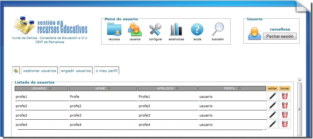 Desde esta pantalla poderás modificar a información de cada un dos usuarios pulsando sobre a icona de editar. Esto pódeche ser útil para cambiar o perfil de cada un. Lembra que a diferencia entre un usuario e un editor é que o primeiro só pode xestionar os recursos propios e o segundo todos os da aplicación.