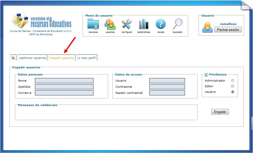 Para inciar a xestión rexístrate con perfil de administrador e vai a usuarios.