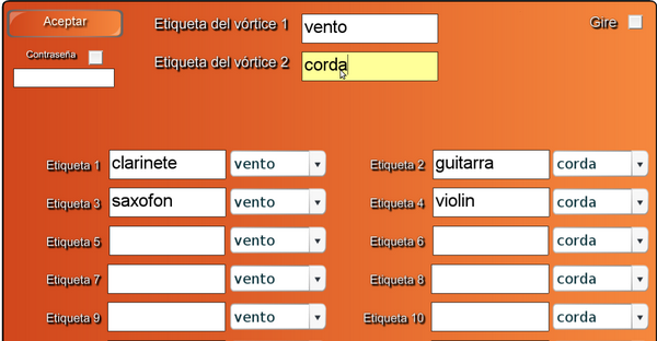 Preme no botón Editar, escribe Instrumentos de vento como etiqueta do vórtice 1 e instrumentos de corda como etiqueta do vórtice 2.