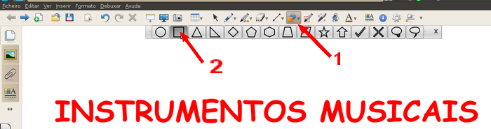 Coa actividade instrumentos_musicais aberta co Notebook , vai á barra de botóns e escolle Formas, selecciona o rectángulo, coloca o punteiro en calquera parte en branco da área de traballo e premendo o botón esquerdo arrastra ata que teñas un rectángulo máis grande que o espazo que ocupa o texto. Non te preocupes se a forma tapa o texto, logo os colocaremos.
